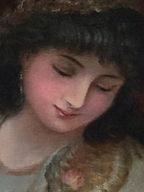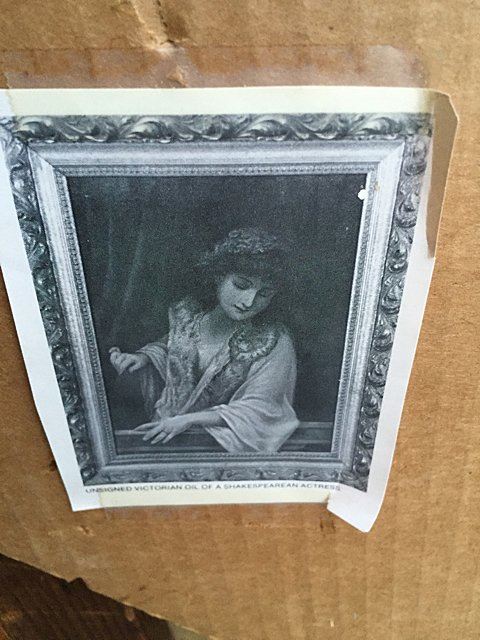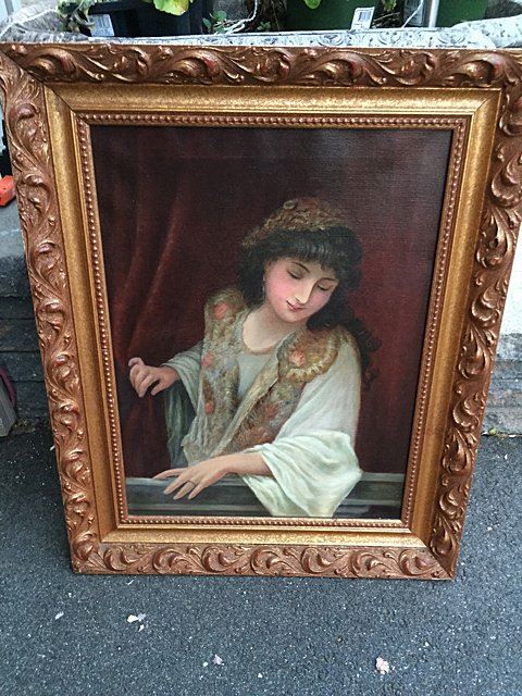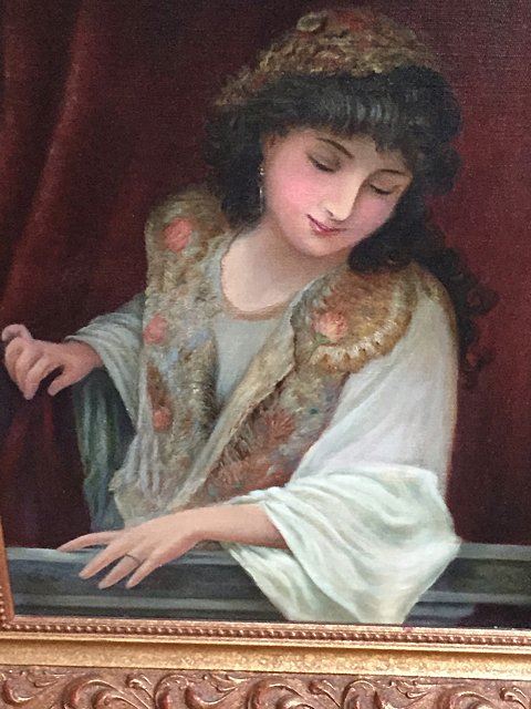 Unsigned Victorian oil painting of a Shakespearean actress in gold gilt frame. Measures 24" wide x 30 1/4" tall.
