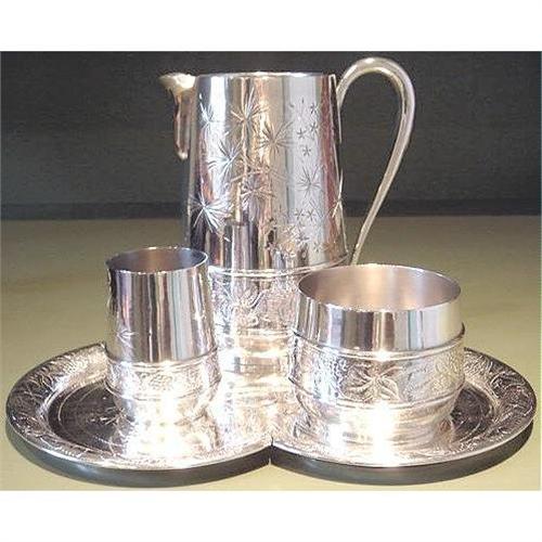 This is truly a fabulous 4 piece Victorian bedside set made of quadruple plate by the Pairpoint Company. It includes a shamrock shaped tray, a large water pitcher, a goblet, and a waste bowl. The ornamentation is wonderful. The edge is a grape and grapeleaf motif. The inside of the tray and the upper portions of the hollowware have a wonderful engraved and etched limb with leaves and blossoms with almost an Oriental mood to it. Each piece has a different pattern number---tray-1121, pitcher-1830, waste-L830, goblet-L627. All four pieces are in excellent vintage condition with no silver plating loss. <p>