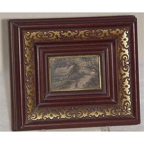 <table width="100%" border="0" cellspacing="0" cellpadding="4"><tr><td><em> </em></td></tr><tr> <td width="100%"> A miniature painting on metal, framed in a beautiful victorian frame, 6 1/4" X 7 1/4", the painting, a rural scene of a thatched roof building by a road and a figure in the foreground. There are some tiny spots of metal showing through the painted surface.