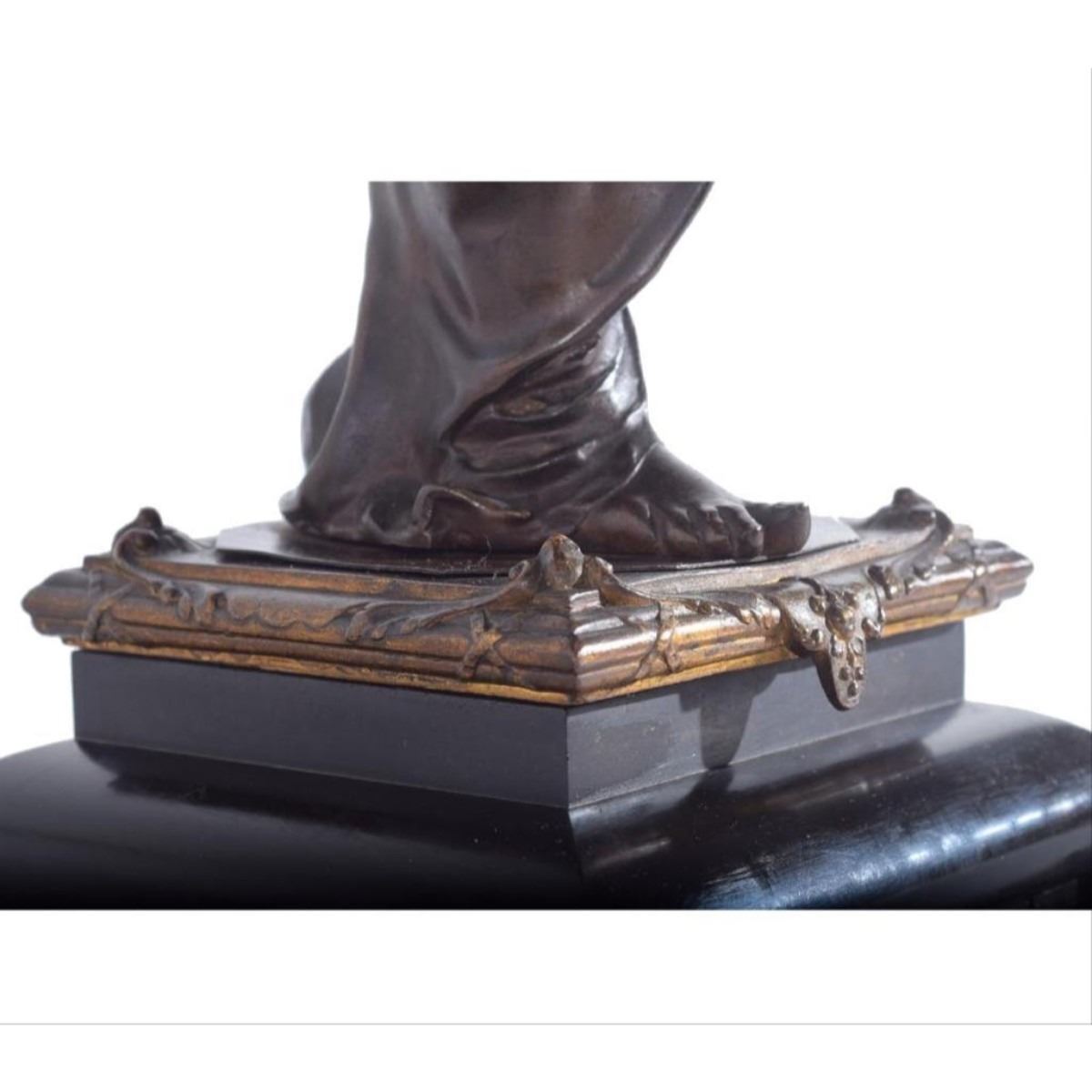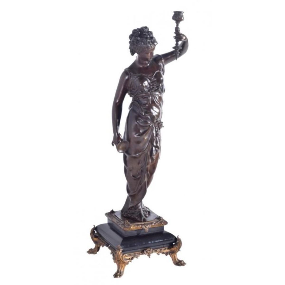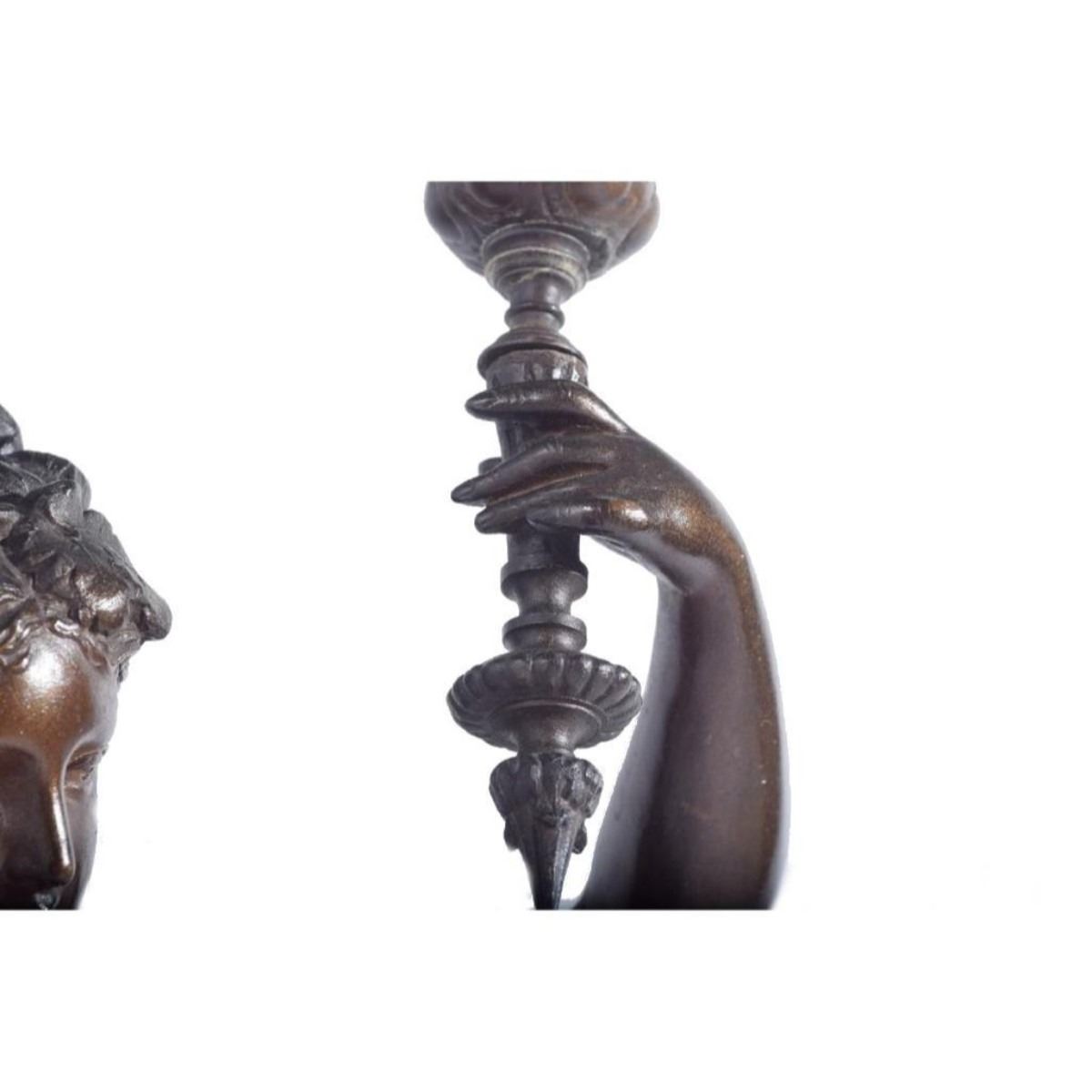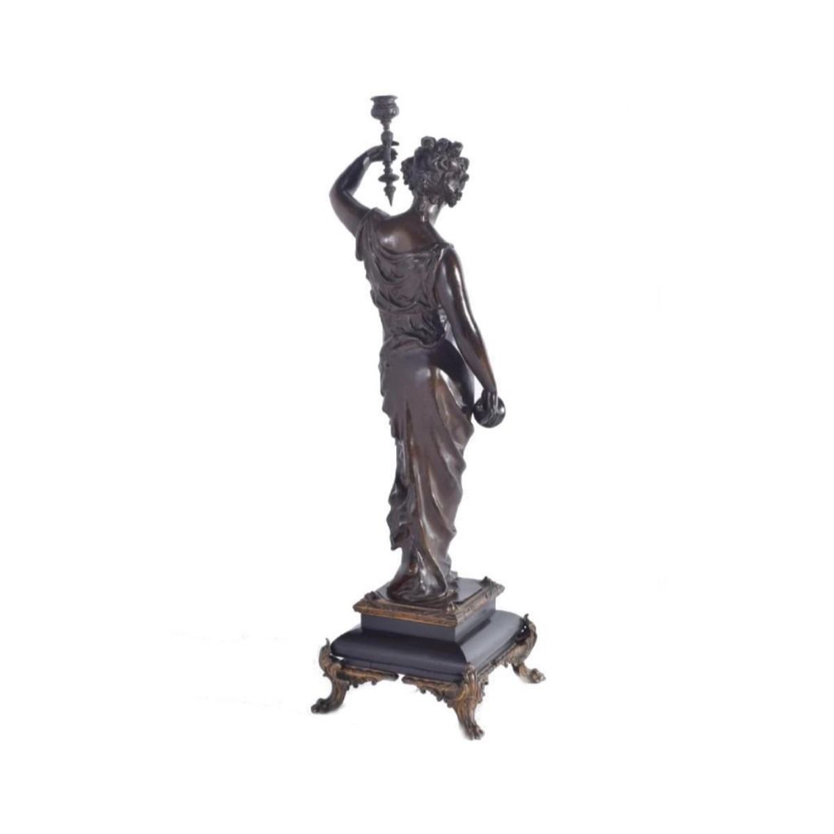 Late 19thc Victorian patinated bronze figure of a classical woman, holding aloft the candle arm, mounted on black slate base. 28"H x 8" sq base. - 9079-012018-LA-0050A