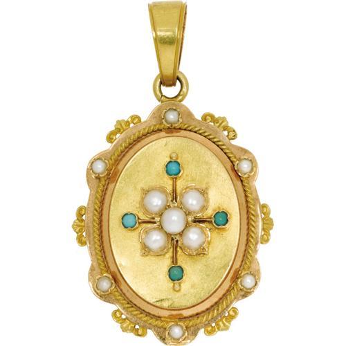Victorian Pearl, Turquoise, Gold Locket-Pendant