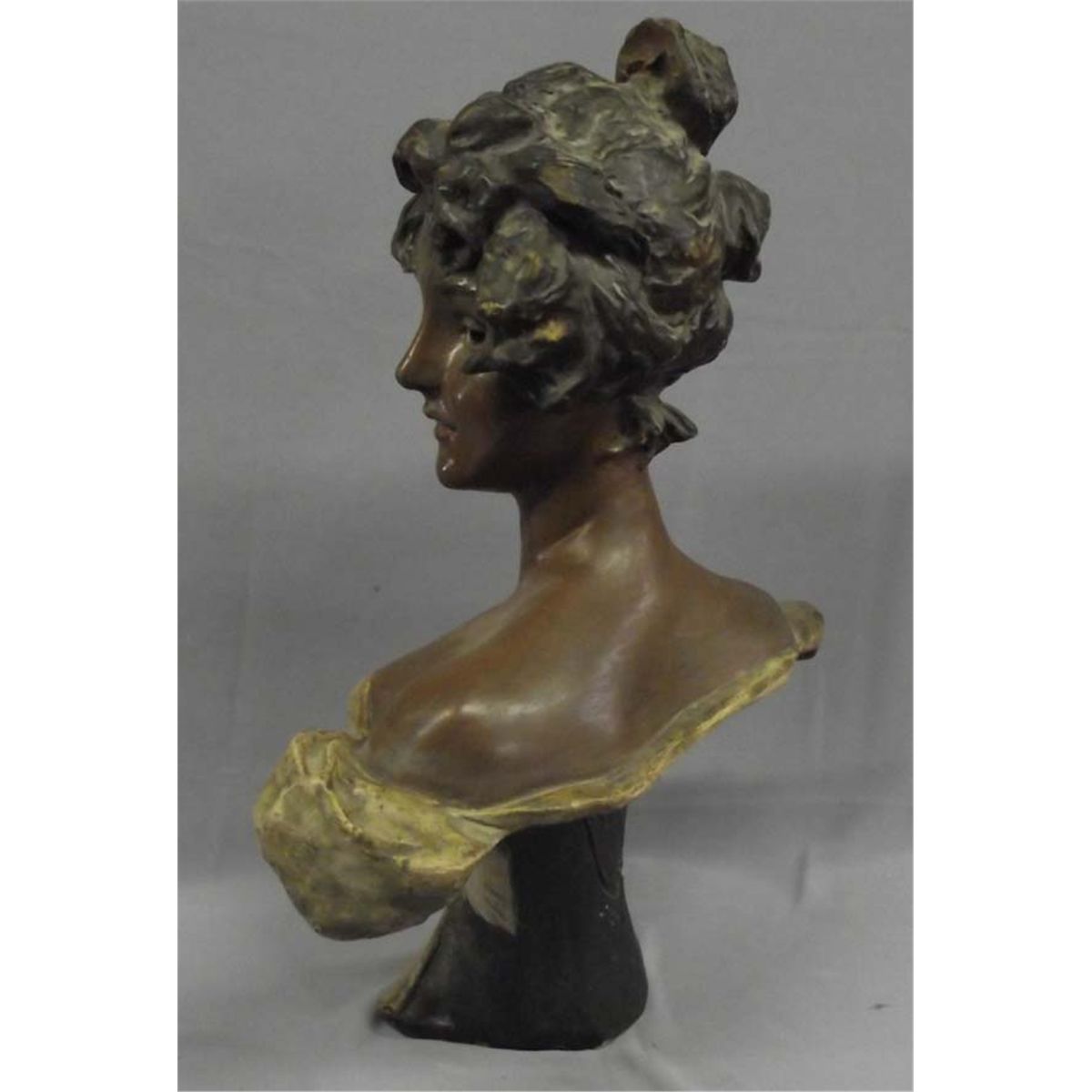 Victorian Plaster Cast Bust. Large hand-painted bust of elegant Victorian lady. It measures 24'' high, 18'' widest point. Signed ''Van Der Staeten'' on the back of the neck. Sculptor was George Van Der Staeten, Belgium, 1856-1928. Old repairs, head has been broken at neck, repaired and re-painted. Missing curl from top of head and normal paint missing due to age. MUST BE PICKED UP.