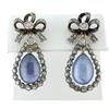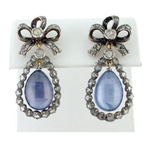 Elegence personified from and era that was defined by craftsmanship and sophistication. These antique Victorian earrings were a status symbol 120 years ago and still are today. These earrings feature two shimmering natural blue star sapphires at 24.00tcw accented by sparkling 1.20tcw Rosecut diamonds. These beautiful natural wonders are set in beautifully designed platinum over gold.