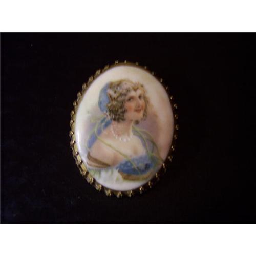 This is a beautiful hand painted portrait on a porcelain pin ,of a beautiful lady.Measures 1 3/4" tall.Very good condition except the little clasp is missing on the catch.Easy to repair but I am not a jeweler.Great Christmas present.