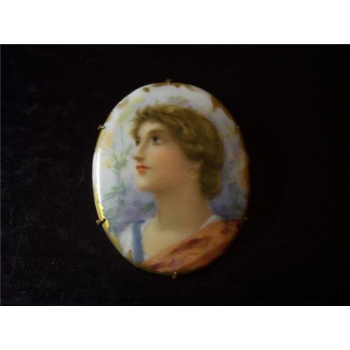 This is a beautiful hand painted portrait on a porcelain pin ,of a beautiful lady.Measures 2" tall.Very good condition.Great Christmas present.Looks wonderful on a high button blouse or jacket.