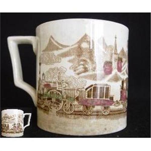 Victorian Pottery Railwayana Tankard Transfer Decorated In Brown With An Early Railway Engine And Tender Pulling Carriages And Coach Through Country Landscape burgess& leigh, Embelished With Green And Pink Enamels (Slight Chip & Crazing)1860-1862.