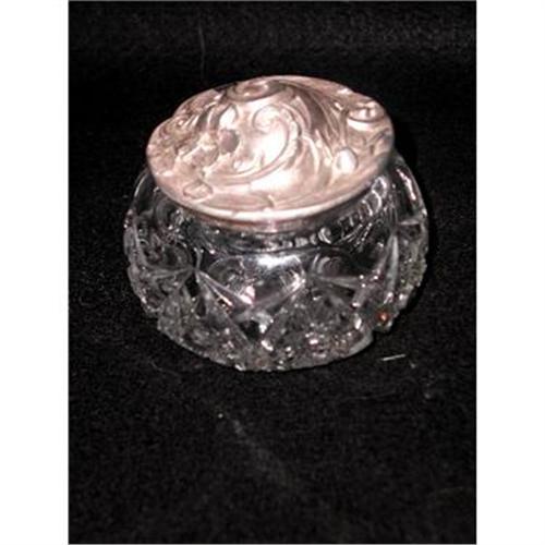C.1910 Victorian cut crystal powder jar has a pewter lid with raised multi floral design. The base has beautiful small starburst and swag motif around the sides with large starburst on the bottom. Super condition. Three tiny spots that are more shiny than surrounding area. Measures 4H X 4.25W.