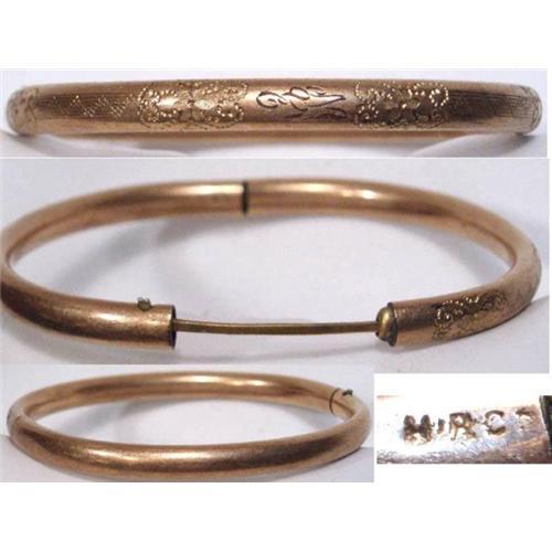 This dates from 1900 and before and has the slide bar in it which lets you know that it is victorian. This bracelet is rose gold filled with tiny flowers on it. Inside it is marked HRC. The bracelet measures 5 1/2" on the inside and is 1/4" wide. This is hollow and the hinge works well as does the clasp. What a beautiful piece!