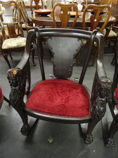 Victorian Red Velvet Carved Lady Figure Head Arms Rocker