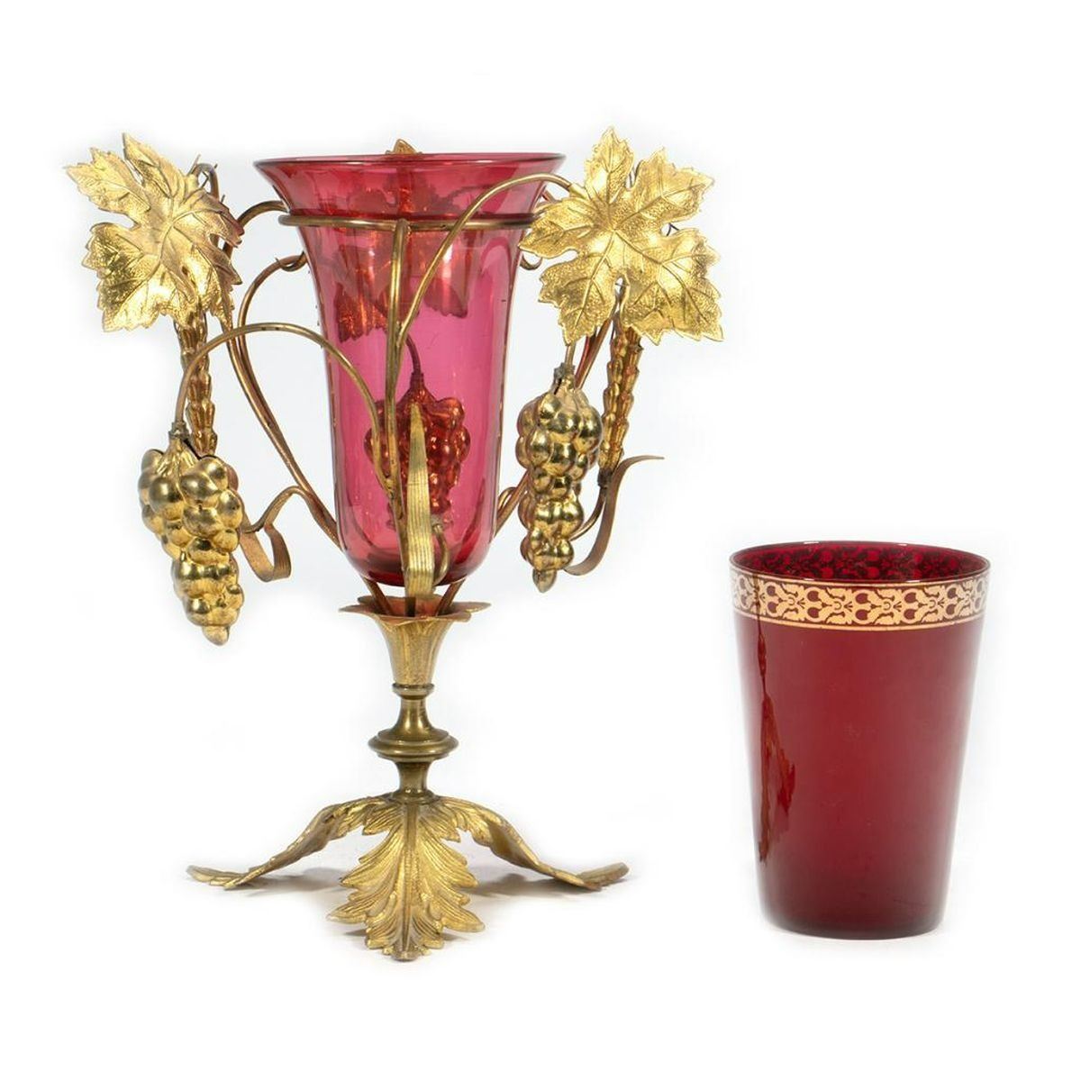 The ruby glass vase enclosed by gilt metal grape vines on an acanthus base. 13in. h. Together with a gilt banded ruby glass cylindrical vase. 6in. h. Condition: Both very good, no chips or cracks.
