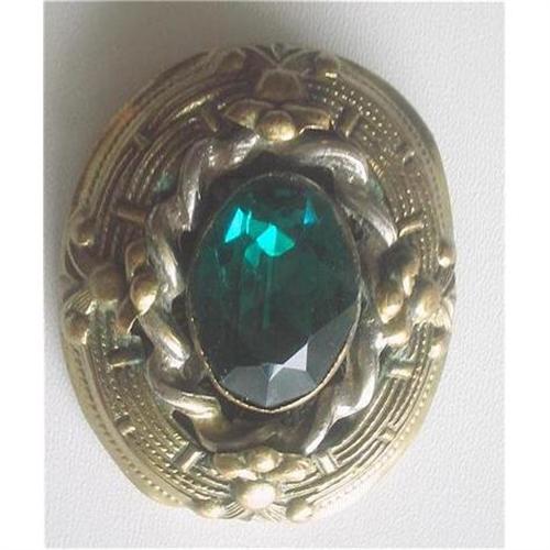 A very ornate dress clip from the Victorian / Edwardian era. Elaborate repousse relief. There is a huge center stone of emerald color faceted glass, bezel set, which measures 3/4" inch tall and 1/2" inch wide, around which is a twisted rope design accented by four Fleur de Lys repousse motifs at points of north, south, east and west of the stone. I believe this is Brass but could have a low carat gold content, although there are no markings to confirm this. The back of the clip is also very ornate, the clip itself has been intricately engraved with scroll work and there is a very pretty filigree layer to which the actual clip is attached, and the clip is very strong and firm. Excellent condition, no flaws whatsoever and the stone is not scratched or scuffed but in minty condition with a magnificent sparkle that comes when a stone is so well cut and faceted. The glass could well be Czech glass. The total measurement of the clip is 1-3/4" tall in height and just under 1-1/2" in width from east to west.
