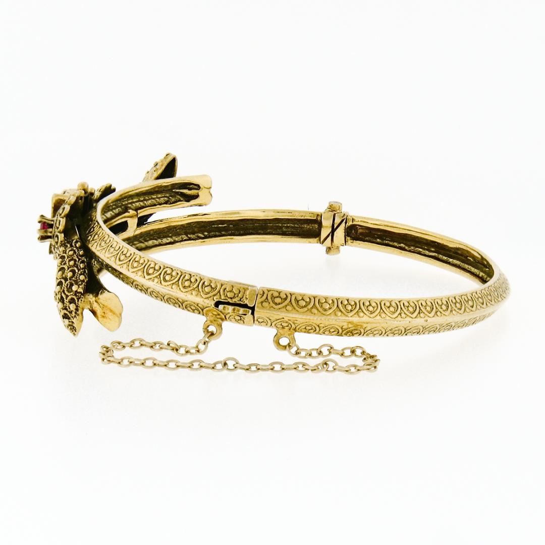 A victorian revival 14k yellow gold hinged bangle bracelet, with 2 round cut natural rubies (0.20ctw), and 3 round cultured pearls (2.25mm). It weighs a total of 18.26 grams, measures 14.91mm wide, and measures 6.25 inches in length.