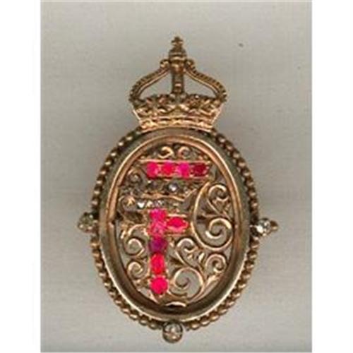 The brooch has the letter "F" in the center surrounded by a pierced scrollwork crown with a granulation bead border. The crest style brooch measures 3.7x2.3 cm and is caught with an 18kt gold pin back. The brooch weighs 8 grams. There are 10 pear, oval, cushion and round faceted cut rubies weighing approximately .55cttw and 10 rose and round brilliant cut diamonds weighing approximately .09cttw and 3 European and cushion cut diamonds weighing approximately .12cttw. The brooch has been appraised for $1800.00 (appraised 2006). Circa 1800?s