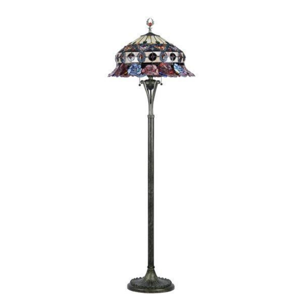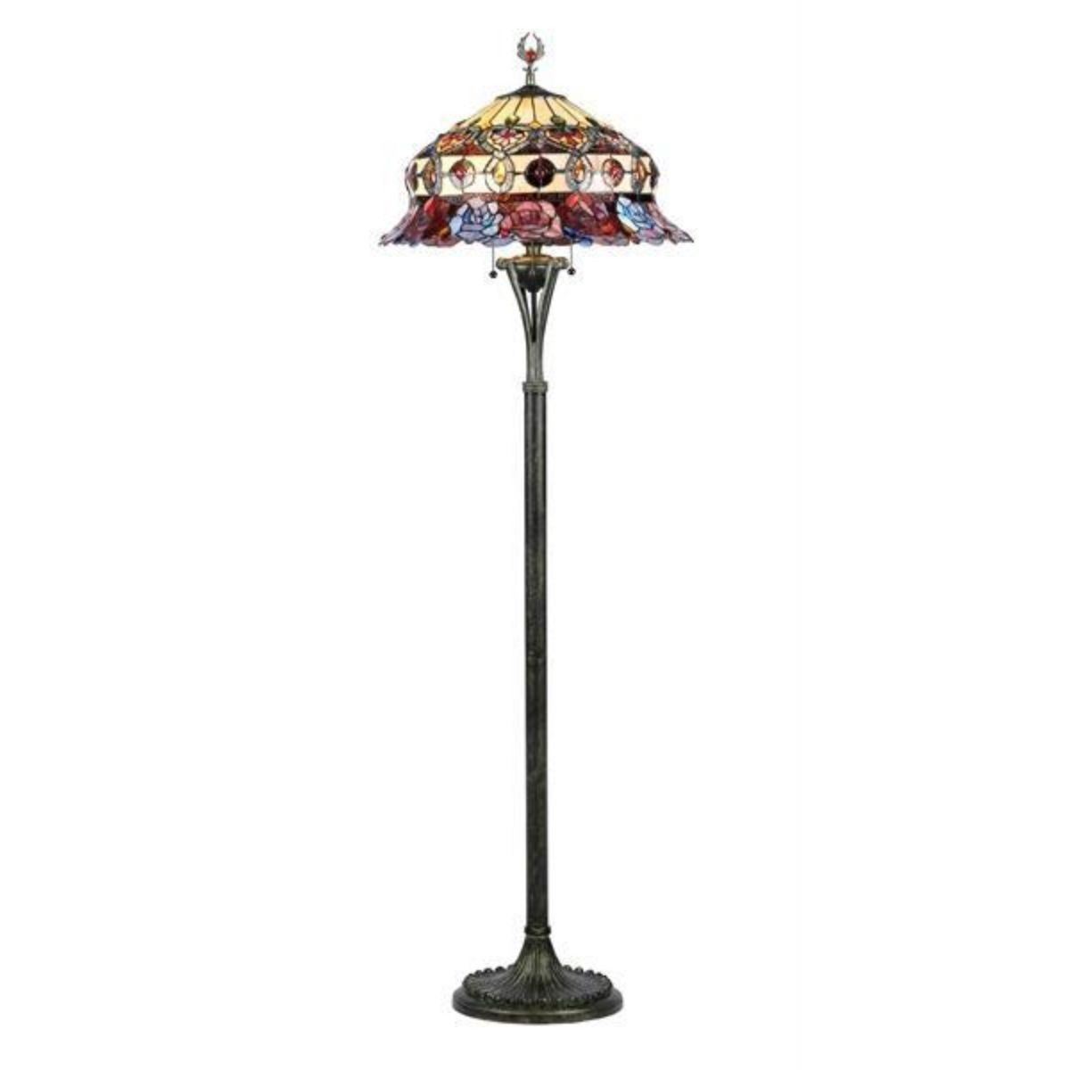 Victorian roses stained art glass ornate shade, created with 765 pieces of stained art glass & 53 glass beads, wrapped in copper foil with antique bronze style finish. Ornate base & finial. 63" H X 20" W shade. 20 lbs.