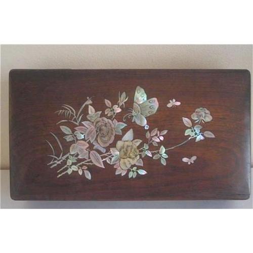 Originally from England and dating to around the early 1900's, this box is a must for the discerning collector. Beautiful rosewood and "ecaille en nacre" (mother of pearl inlay) is shell inlaid on wood. I believe it is actually a letter or document box but can be used as a trinket / jewellery box or for keepsakes and momentos. Magnificent mother of pearl inlay floral spray on the lid of the box, highly detailed even to the tiny minuscule thorns on the stems of the roses. A large butterfly hovers overhead accompanied by two smaller butterflies. It has a push button opening, possibly brass but greatly darkened with patina, as is all of the fittings. There is a small "arm" inside to the right for holding the box open. There is also mother of pearl inlay on the back and left and right sides of the box in the form of flowing vines and leaves. I have closely examined this box with a jeweler's loupe and find all of the inlay to be present. There is however a very small abrasion to the wood on the top of the box that looks at first to be part of the overall decoration (about 5m x 3m) and could easily be touched up. There are two hairline cracks or "splitting" due to age, toward the back at the top, barely visible and appear at first glance to be part of the grain of the wood. All in all, this has done remarkably well for it's considerable years and is in very fine condition with minimal signs of age / wear. The measurements are 9-1/4" inches wide from left to right and 5-1/8" ...
