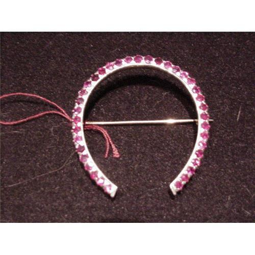 Impressive Victorian silver topped yellow gold and ruby "horseshoe" motif brooch set with 37 brilliant cut rubies. Wonderful design. Vibrant rubies beautifully set. Reverse: lever catch safety, ball hinge. All original. Wonderful piece