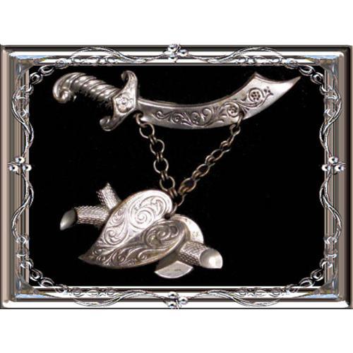 This is an early deco Sweetheart brooch that is 3" x 3". The repousse sword at the top holds a heart with something that has pierced it. These old sweetheart pieces are not that easy to find and this one is really quite the unusual one.This is old and is in very good shape less some silver wear on the chain.