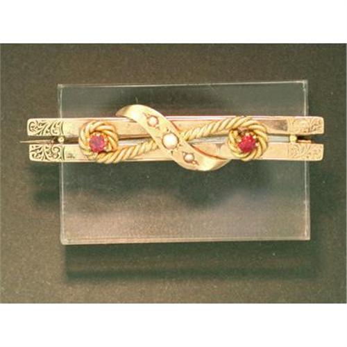 <tr><td>Title:Victorian Seed Pearl and Ruby Pin 9k Gold</td></tr>