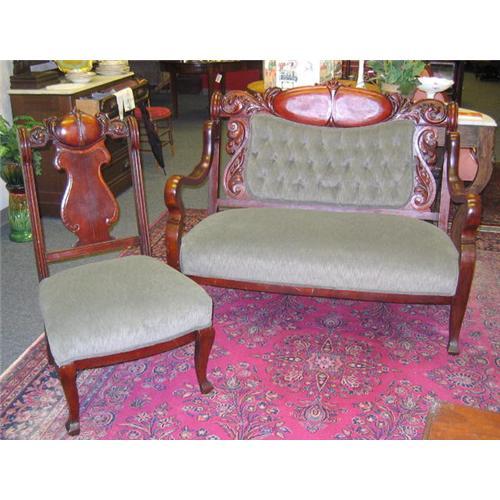 <table width="100%" border="0" cellspacing="0" cellpadding="4"><tr><td><em> Carved Griffins and great details!</em></td></tr><tr> <td width="100%"> Great looking settee and chair set in great condition. Carved griffins adorn the crest of each piece. Quite substantial with raised arms and solid construction. Just reupholstered! Please email with questions. </td></tr><tr> <td> </td></tr><tr> <td>Reference #: F074</td></tr><tr><td>Condition:Very Good</td></tr><tr><td>Year:c. 1900</td></tr><tr><td>Country:USA</td></tr><tr><td>Height:42"</td></tr><tr><td>Depth:26"</td></tr><tr><td>Width:51"</td></tr><tr><td>Title:Victorian Settee and Chair - Griffins</td></tr><tr><td>Location:Peekskill, NY</td></tr></table>