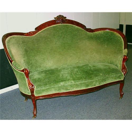 Victorian salon suite consisting of a settee, an armchair, and three side chairs. The decoratively scrolled mahogany back rails, curvilinear arms, and legs display good grain and patina. A sylized animal head appears at the top back. The chairs have shield backs while the settee is barrel backed. The cabriole legs end in ball-and-claw feet with brass casters. The seats, backs, and arm pads are richly upholstered with green velvet and similarly colored rickrack edging. 30" (76cm) high to the top of the crown, 17.5" (44cm) high to seat, 68" (173cm) long, 19" (48cm) deep.