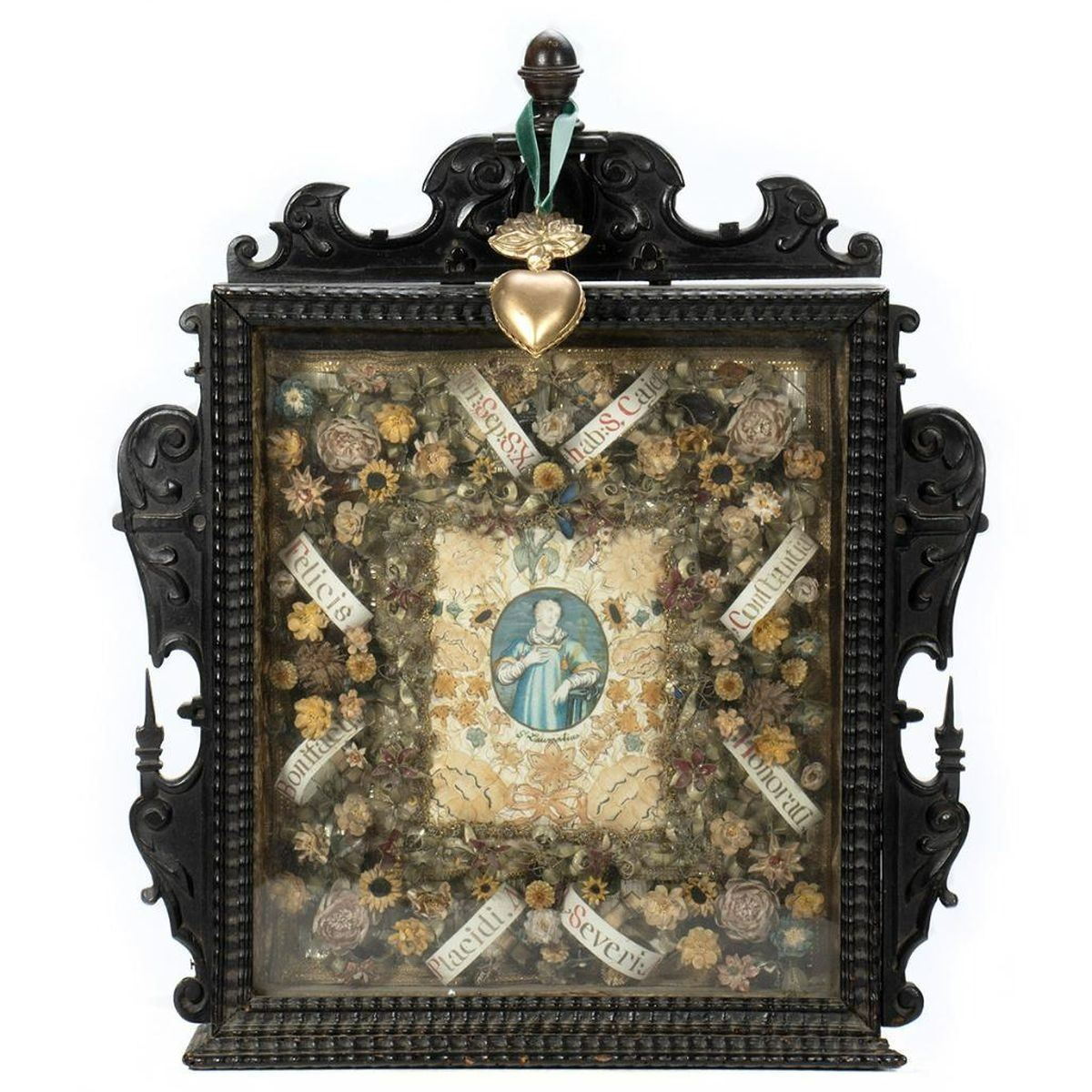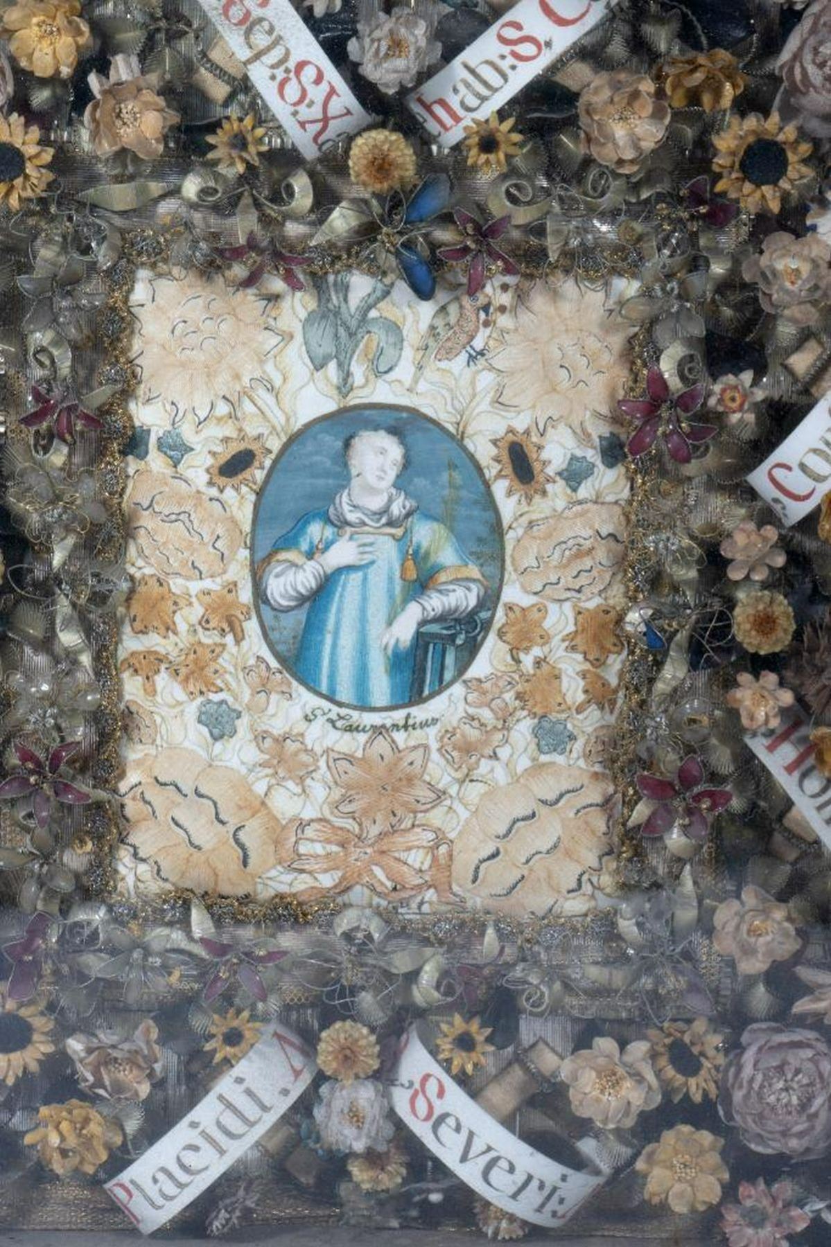 A textile image of St. Laurentius within a wreath of silk flowers. 18 1/2in. h. 16in. w. 3in. d. Condition: Loss to outer frame scroll.