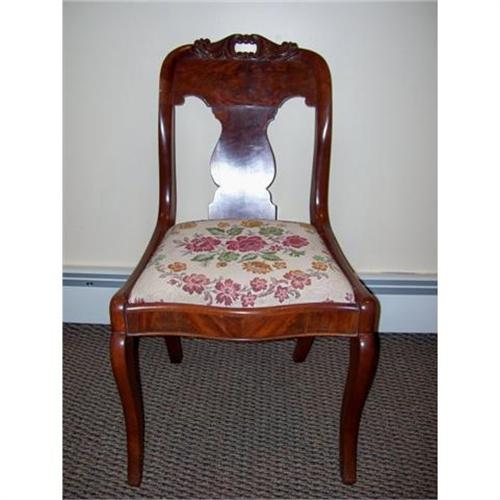Beautiful Victorian side chair dating to the early 1900's. Pretty floral cotton material on the seat cushion. Very nice carved crest rail. The seat measures 16" off the floor, 33" from floor to the top of the back, and 15" by 18 1/2" on the widths. This chair is in very good condition with no problems to the finish. I have another chair that is a very close match to this one listed separately.