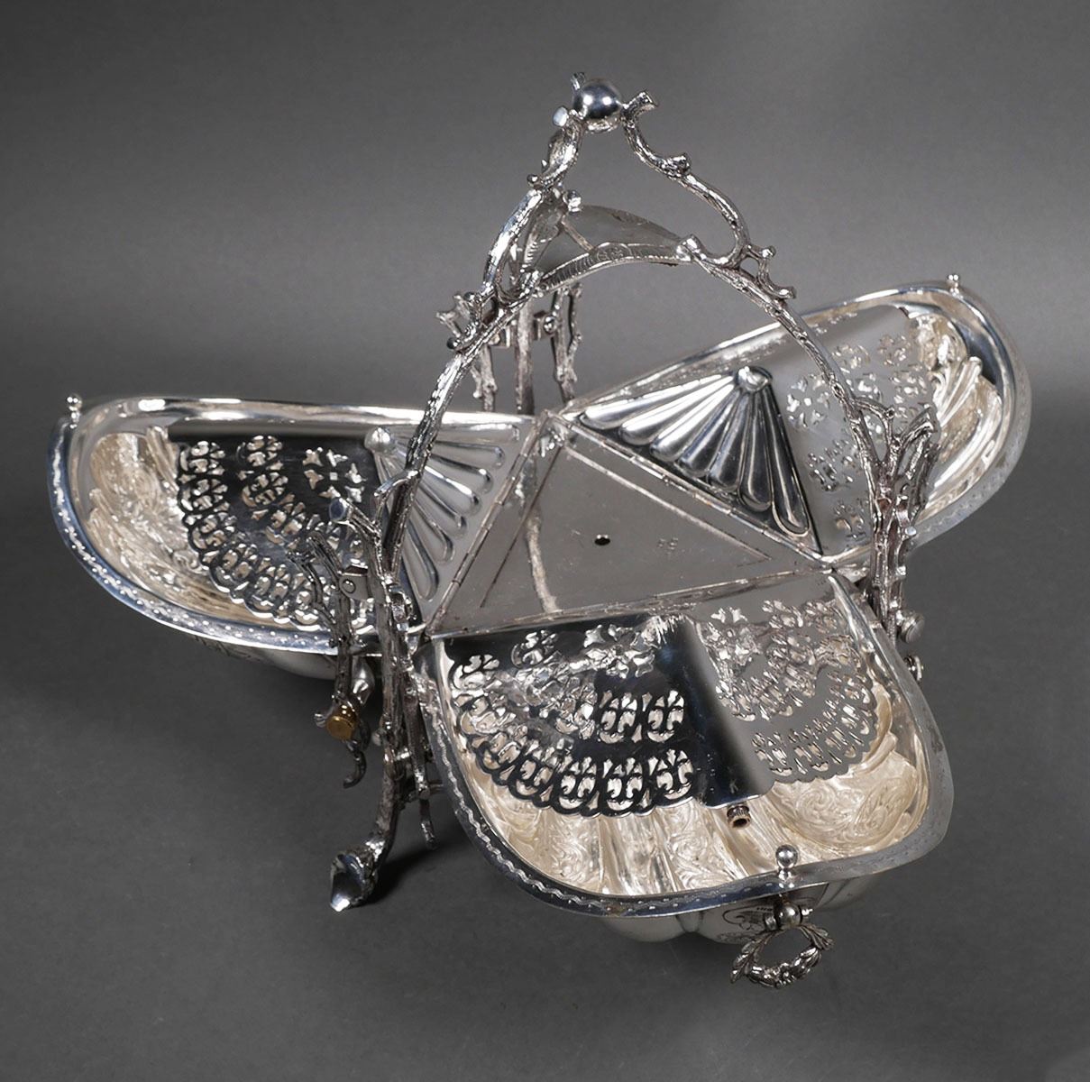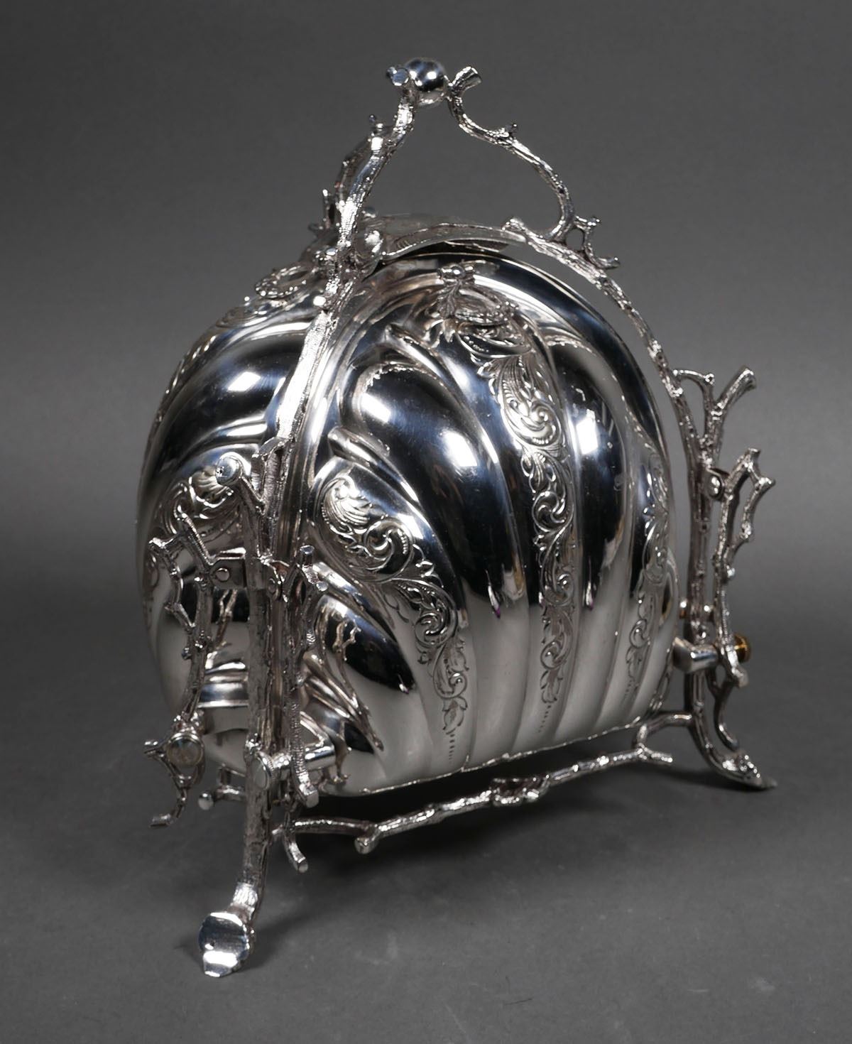 Late 19th century, ornate English silver plated biscuit or bun box, three-sided. Fine condition, measuring about 8-3/4" wide per side and 10" high.