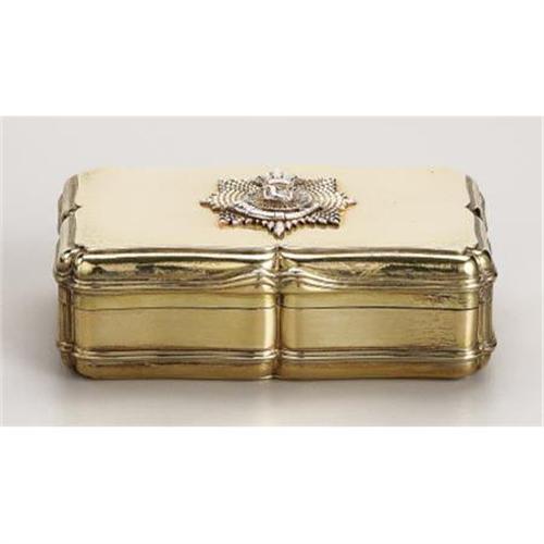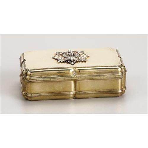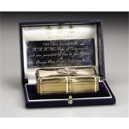 <B>Victorian Silver-gilt Presentation Snuffbox</B></I><BR><I>Marked William Summers, London, 1868 WS N </B></I><BR><BR>Rectangular, of shaped outline, applied with a star of the order of the Queen's Own Light Infantry Militia below Royal British crown, in retailer's box with silver plaque engraved with dedication inscription (by Prince Arthur of Britain)<BR><BR>Queen Victoria's favorite son, Prince Arthur William Patrick of Saxe-Cobourg-Gotha (1850-1942) was created Duke of Connaught and Strathearn in 1874. He had a distinguished military career, rising to Field Marshal in 1902, and served as Governor-General of Canada from 1911 to 1916.<BR><BR>Provenance: <BR>Presented by Prince Arthur of Great Britain to the officers of the Queen's Own Light Infantry Militia, 1869.<BR>Purchased at Asprey & Garrard's, London<BR><BR><b>Shipping:</b> Requires 3rd Party Shipping (<a target="_blank" href="http://www.heritageauctions.com/common/shipping.php">view shipping information</a>)