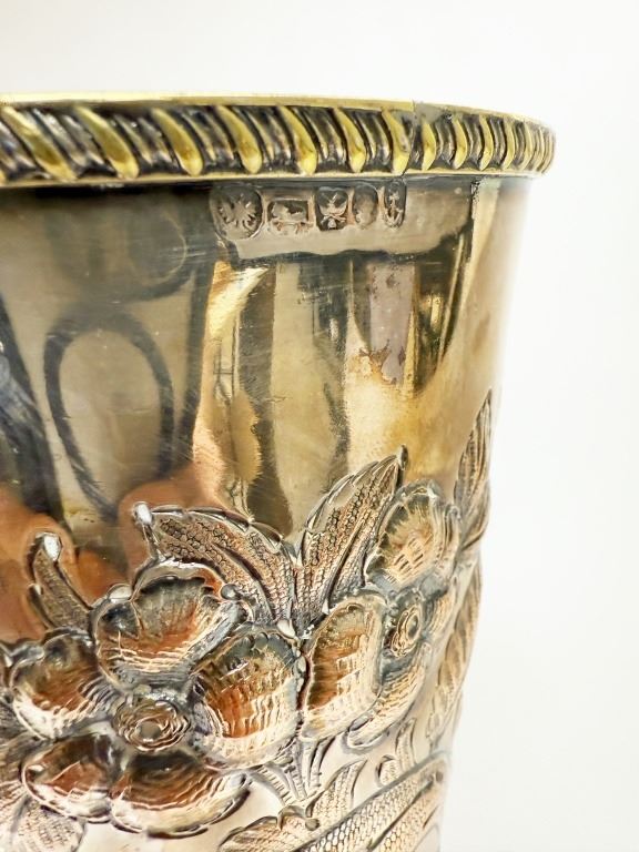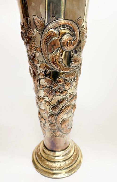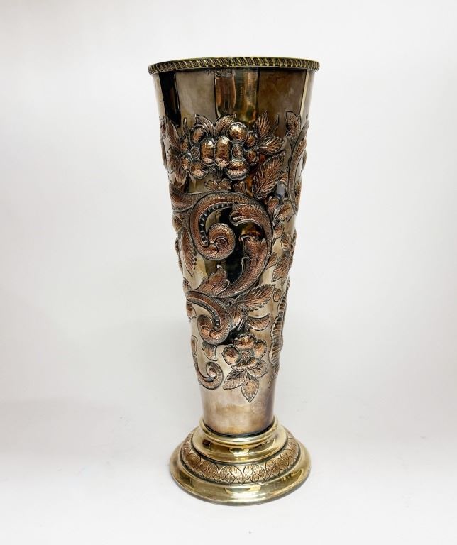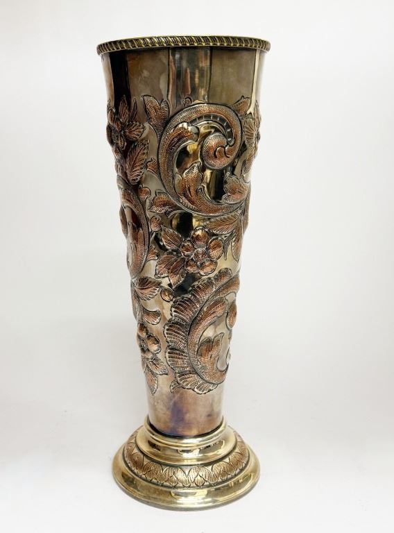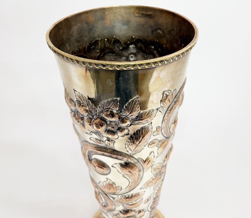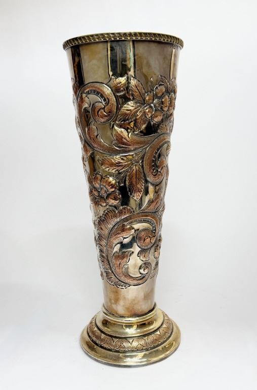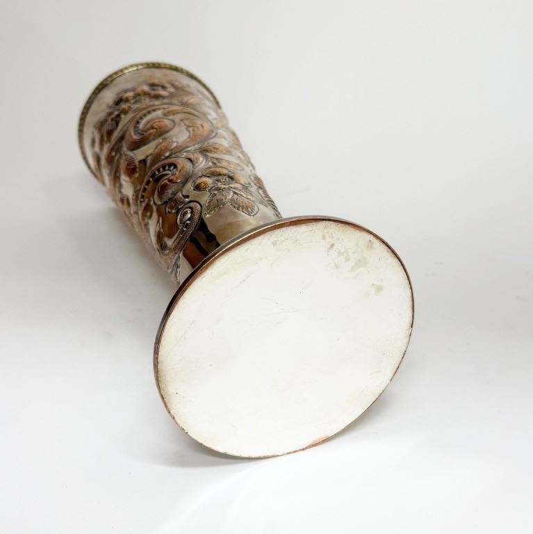 Item/Description: Victorian silver-plated trumpet vase, crafted in the late 19th century, features intricate repousse floral and vine motifs. The Art Nouveau ornate design is complemented by a flared base with a decorative rope-like rim. This piece serves as a decorative vase or a "specimen vase," primarily used for displaying cut flowers as an elegant table centerpiece or as a decorative accent in a home.