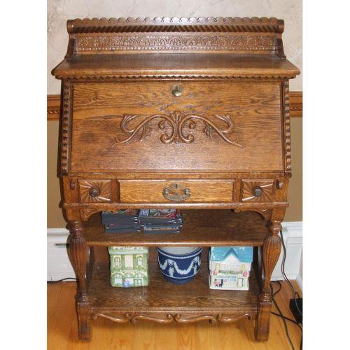 American. Victorian. Late 19th century. Oak. Heavily carved oak desk with a carved gallery above a slant lid writing surface, revealing interior compartments; all on a base with a carved skirt, fluted baluster posts, double shelf stretchers and scrolled feet. 40" high X 32"long.