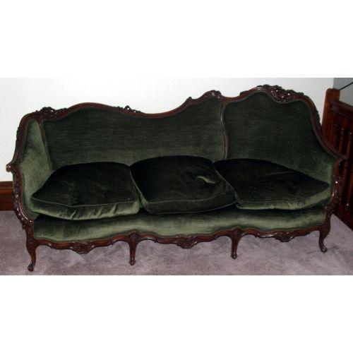 un-attributable. Victorian. Late 19th-early 20th century. Mixed woods. Rococo Revival with a carved walnut frame, small cabriole legs, a shaped carved skirt, scroll carved arms with a continuous carved crest rail; all covered in green velvet upholstery. 36" high by 78" long
