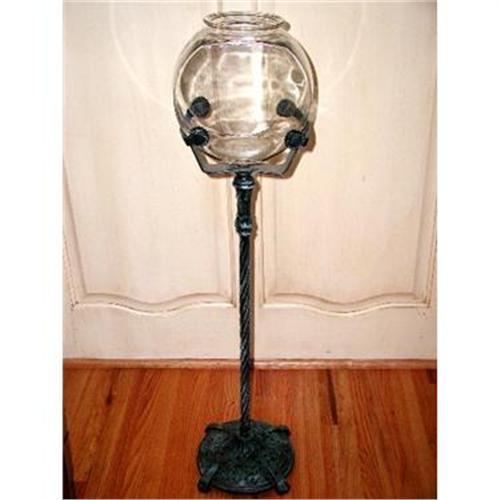Unusual Victorian verdigris wrought iron decorative fish bowl and stand C.1885. Ornate round sturdy base with 4 feet has pierced work below the swirled cane style pedestal. Four metal rosette clamps with base hold the 8.5H X 8.5L X 5 D fish bowl securely in place. The fish bowl has no doubt been replaced over the years,with the stand being original. Beautiful viewing of the fish in the style with no threat of cat attack as would be on a table version. Overall measurement of 36.5H X 8.5L X 9D bowl and stand.