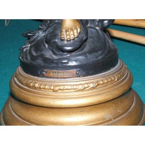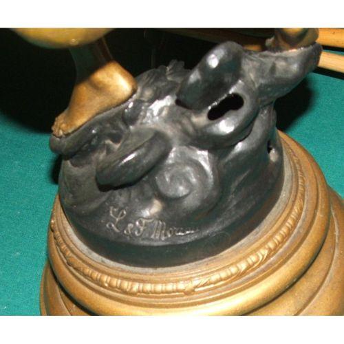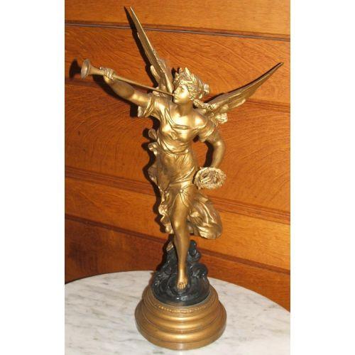 after August Moreau (French 1834-1917). Victorian. Gilt metal. A Victorian statue of a winged angel blowing a horn. The statue is finished in gold and black painted rocks, and signed on the plaque in front. 28" high