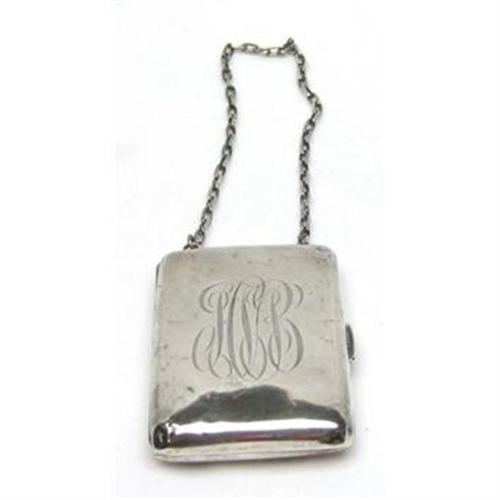 This very rare fine Sterling Silver ladies purse was made by R. Blackington & Co. of North Attleboro, Massachusetts that was founded in 1862. It contains three separate coin holders, a round hinged compartment, a hinged compartment in the middle that was possibly for matches and a cigarette holder with clip on the opposite side. It is marked on the edge with Sterling, the Blackington hallmark and the number 5679. The cigarette holder and underside of the middle hinged compartment cover has the number 120. This lovely piece has a chain link handle. Purse measures 3 1/2" X 2 5/8" and is about 7/8" thick. There are some minor dings here and there and it is monogrammed with fancy lettering. It weighs 146.1 grams or 4.7 troy ounces.