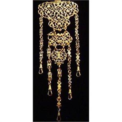 C. 1898 England. Decorative chatelaine with five chains ending in swivel hooks. Belt hook on back marked with English sterling marks for 1898. Generally, in fine condition, except for minor loss in center section, not very noticeable because of elaborate filigree. This item is about 110 years old, before clothing had pockets, chatelaines were used to hang and carry keys, sewing needles, notebooks, etc. In very good condition.