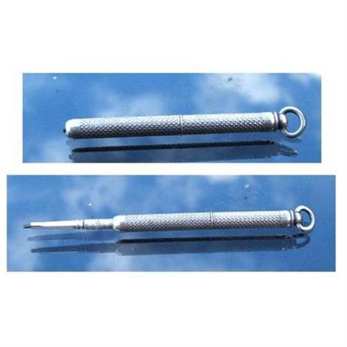 This is a beautiful victorian retractable sterling silver pencil with the ring at the top to hang from a chatelaine. This is actually marked "Sterling Silver". Usually pieces are just marked Sterling. It has an overall diamond pattern and a very tiny smooth area, I guess would be for a monogram. This does not have a monogram though. Total length open is 3" and when closed it is 2". It is in excellent condition an has some lead in it. . A most excellent Victorian Chatelaine pencil to add to a collection.