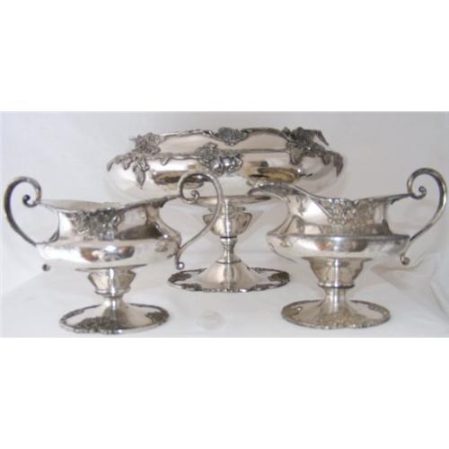 This is a glorious and rare Strawberry Set. A large bowl, a creamer and a sugar bowl, each heavily embossed with strawberry vines. The interior of the large bowl is gilded and shows signs of wear in the center and on one side. The interior of the creamer shows the most wear. There is evident wear also to the handles. This item was used lovingly as there is no damage other than the loss of plate and no repair. An unusual and beautiful example of an elegant past. Still usable of course.