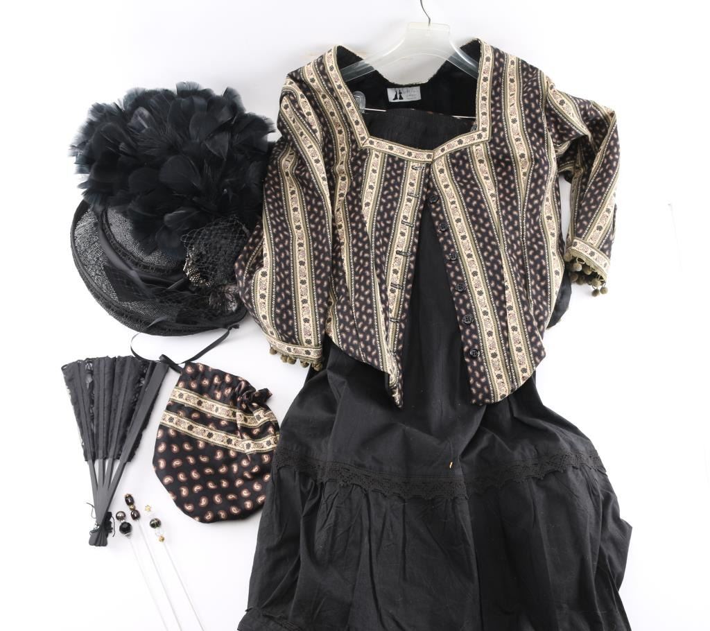 Re-enactor's quality Victorian Ladies costume consisting of jacket, 2 skirts, hat, cap, waistlets w/ lace, hat pin, fan. Abbie's Attic tag (Prescott, AZ). Very good plus condition. Medium to large size.