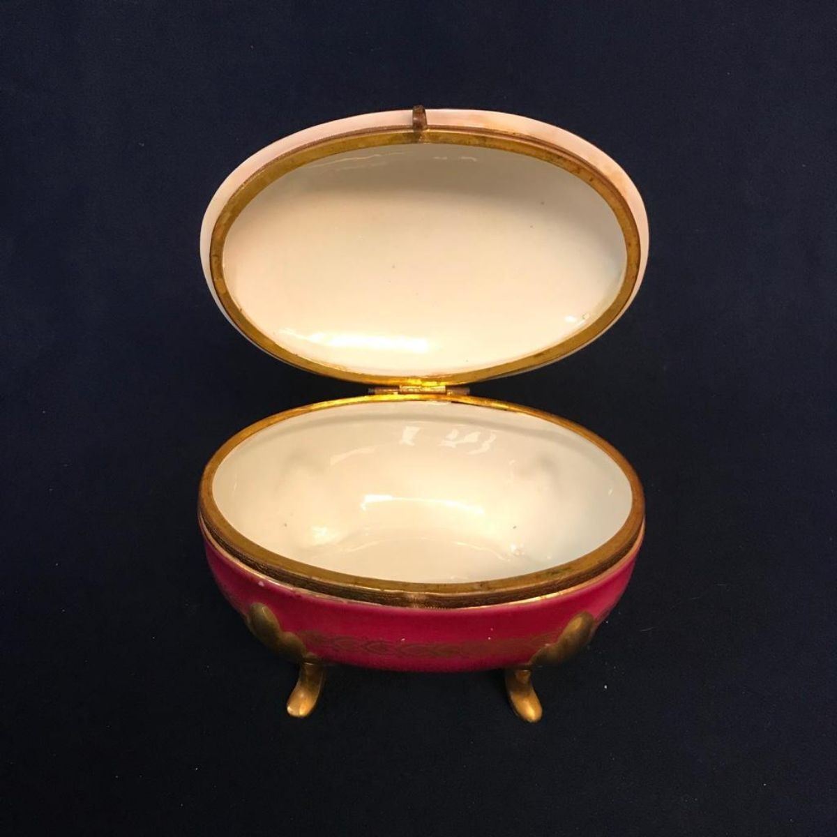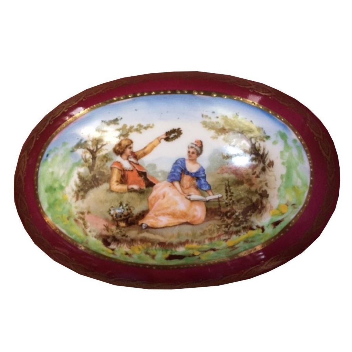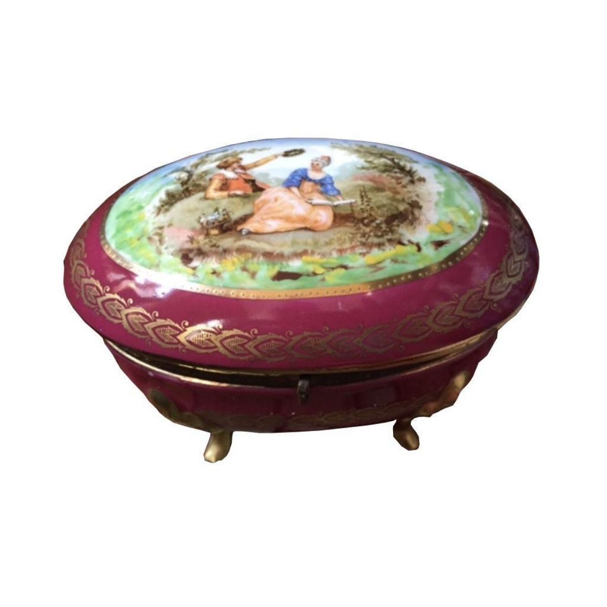 Victorian style gilt porcelain oval jewelry, trinket box, with hand painted courting scene on the lid. Footed with gilt legs & brass hinge. 6" W X 4" D X 4 3/4"H.