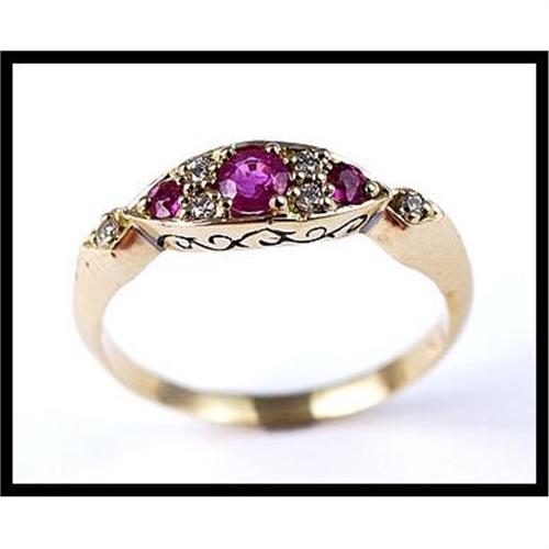 This Victorian style ruby ring with is captivating and classic. With the traditional simplicity, the 14K yellow gold ring features 3 round cut rubies weighing approximately .35 carats and 6 full cut diamonds weighing approximately .10 carats total weight. The ring size 7-3/4 and it measures 5 mm (3/16 inches) x 14mm (9/16 inches).