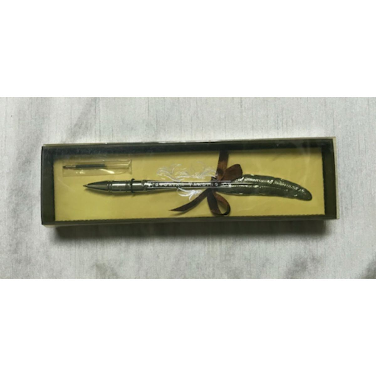 Victorian-style, silver metal ballpoint writing pen, shaped as a quill feather pen. Desk set, gift accessory with extra ink cartridge.Â