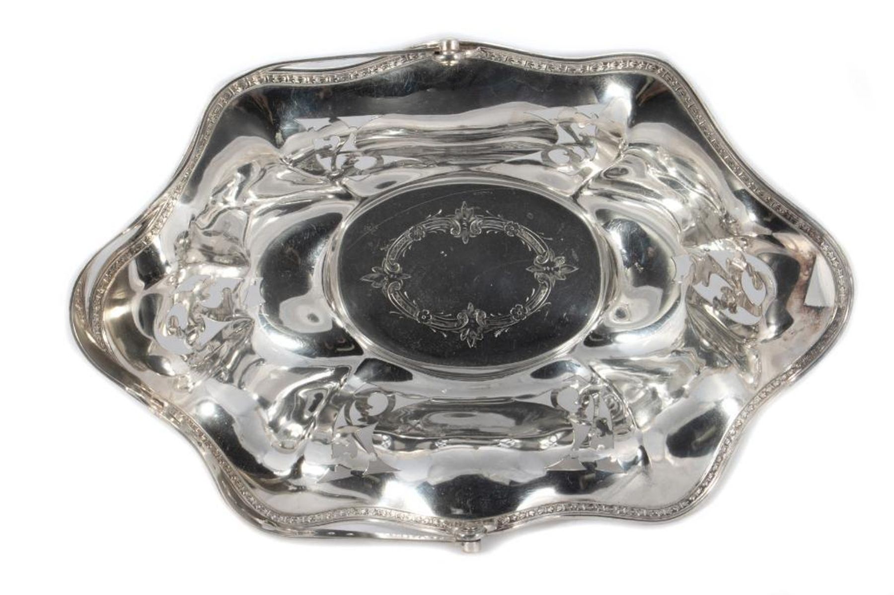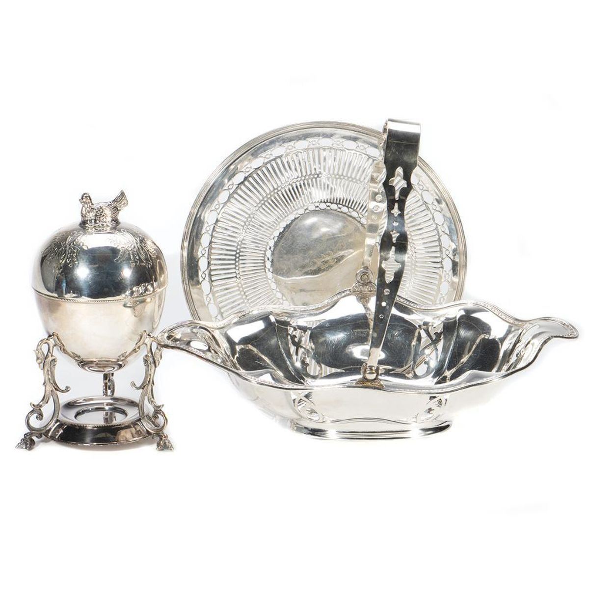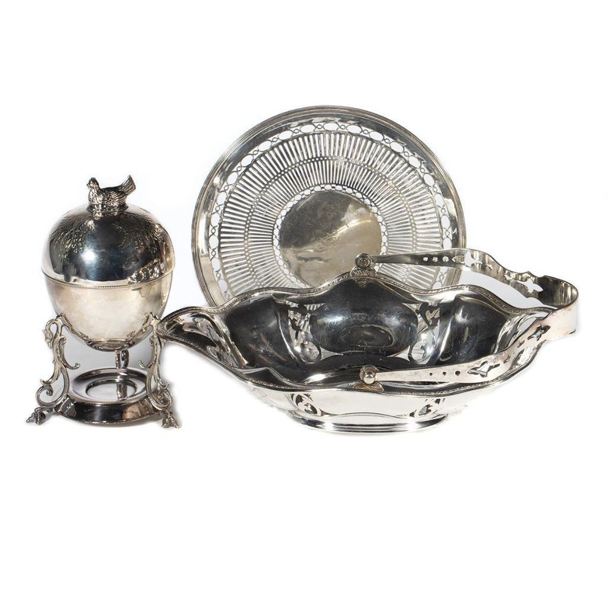 Including a very charming Egg Server, a Cake Basket and Sheffield pierced plate. Height of Egg Server 9in. (23cm) Condition: Very good.