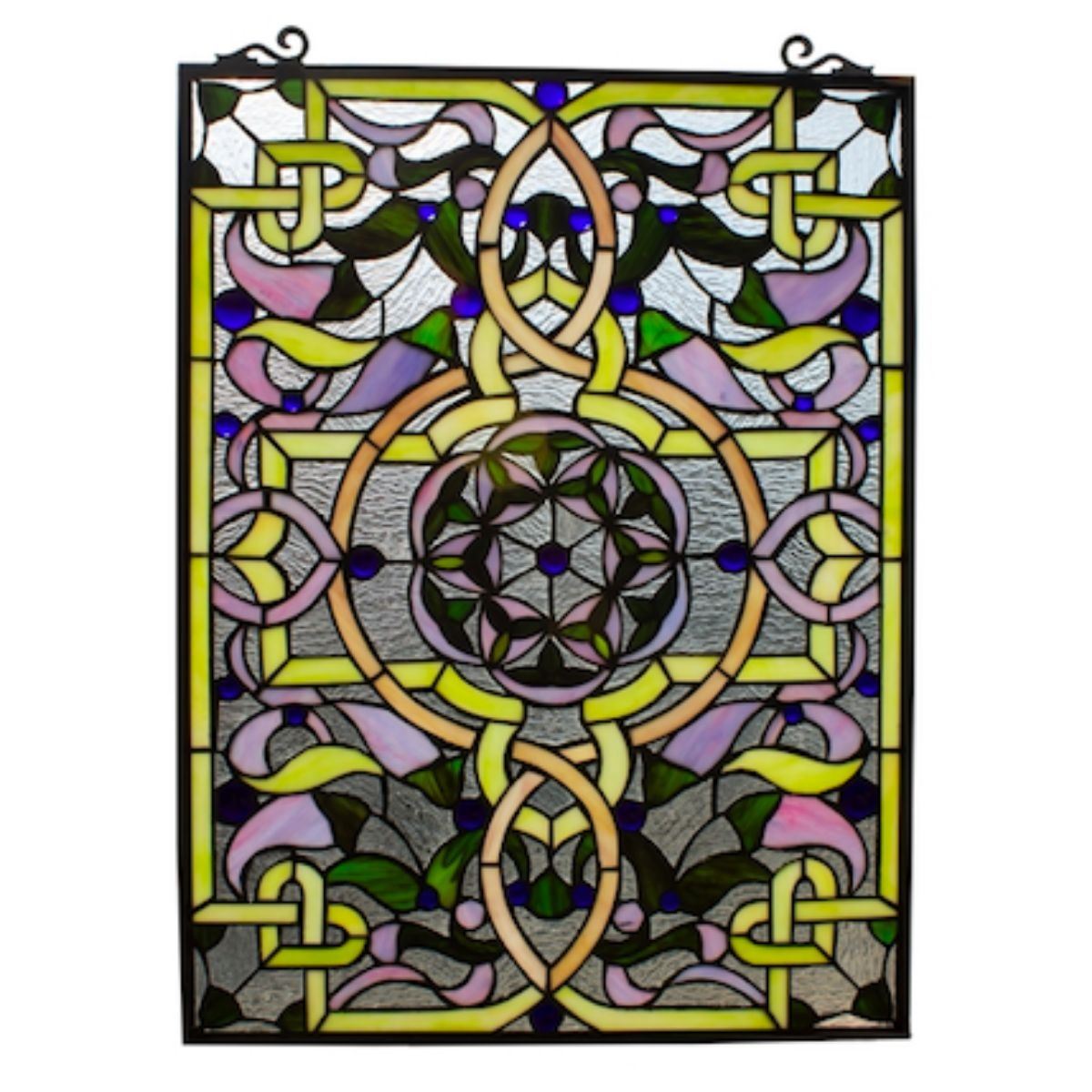 Victorian stained art glass hanging window panel, created using over 450 pieces of stained & clear art glass & glass beads, wrapped in copper foil. 18" X 25". Comes with hanging chain.