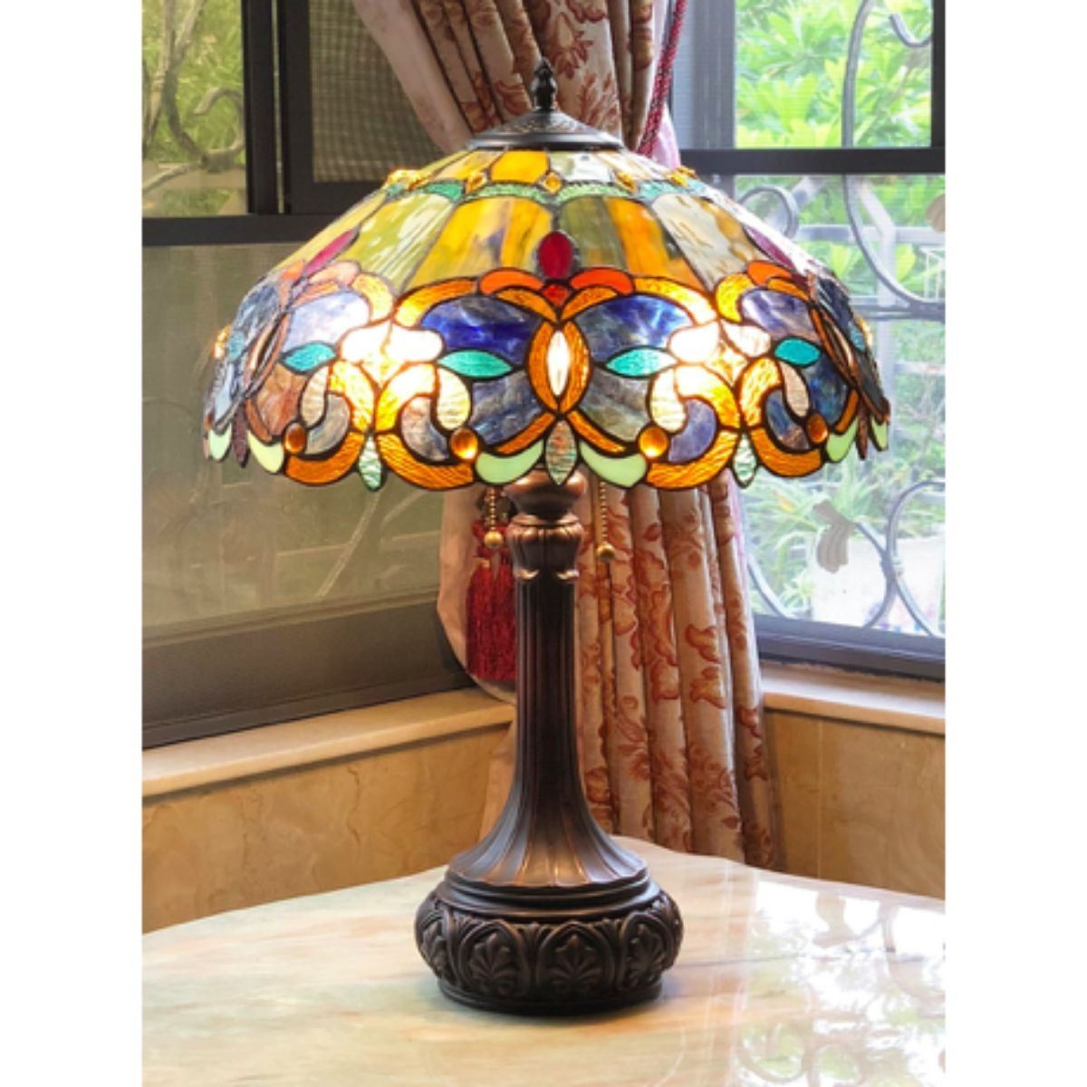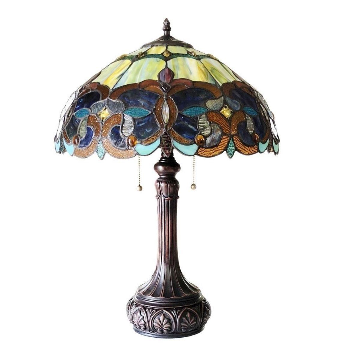 Victorian stained art glass 2-light table lamp, created with 348 pieces of stained art glass & 60 glass beads, wrapped in copper foil with dark antique bronze finish. 24" H X 24" W shade.Â