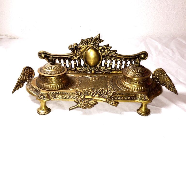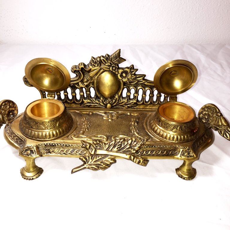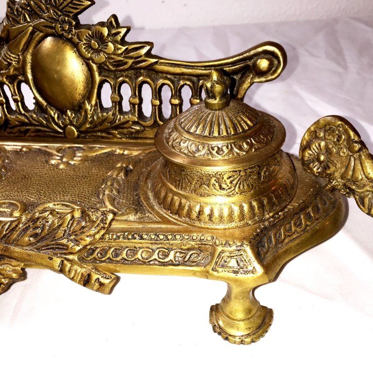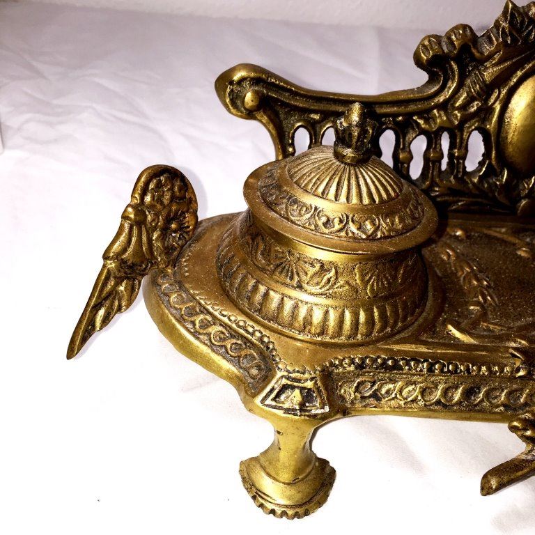 A nice 11" brass ink stand with ink pot wells. Winged details and Victorian stylings.
