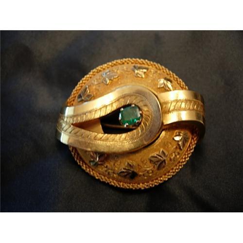 Attractive Victorian 15ct yellow gold and emerald stylized buckle brooch centrally set with one prong set emerald embellished with beautiful engraved and applied yellow gold details. Textured gold with gold braided surround - Reverse: c-catch, tube hinge, pin stem, hook - Great condition!