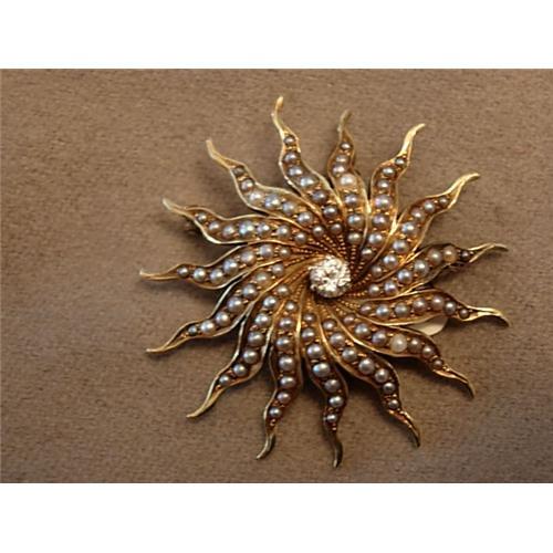 Pretty Victorian Circa 1900 diamond pearl and yellow gold Sunburst brooch/pendant set with one .15ct Old European Cut Diamond and numerous natural pearls set in the "rays" all set in yellow gold. Reverse - replacement safety catch ball hinge retractable bail so that the brooch may also be worn as a pendant. Very pretty look!