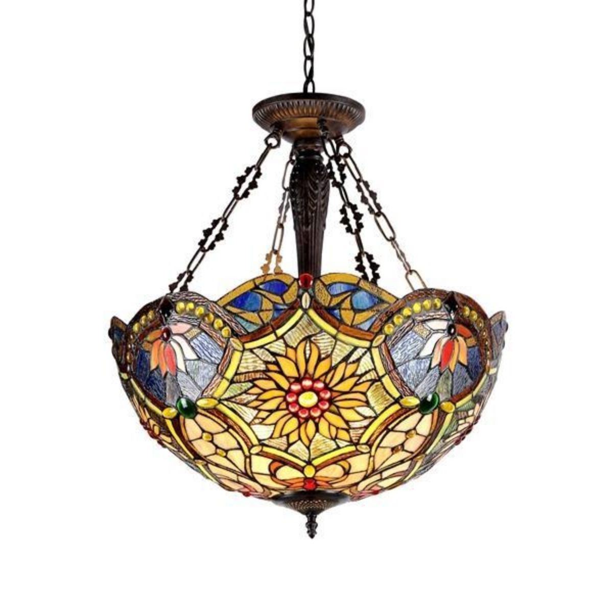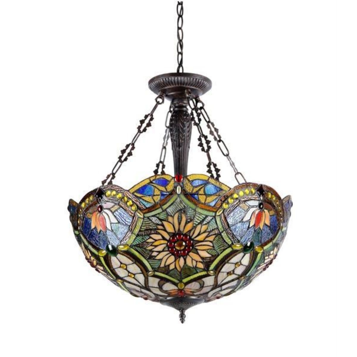 Victorian-style sunflower theme stained art glass inverted ceiling 3-light pendant, created using 796 pieces of stained art glass & 148 glass beads, wrapped in copper foil with an antique bronze finish. 26" H X 21 1/4" W.Â