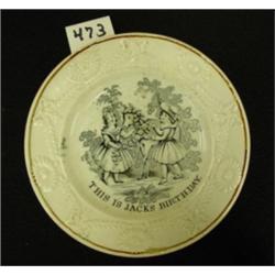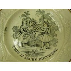 Child plate. Victorian transferware. Image of two children decorating a pony with a chain of flowers. Caption is "This is Jack's Birthday". Flowers and bows around the border. Circa early 1800's. No maker mark. 5-3/4" wide. Condition: Two small hairlines. Roughness in mold and chips under the glaze.