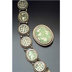 Victorian Tested 14-Karat Yellow Gold and Green Foil-Back Bracelet and Locket Brooch Last Quarter 19th Century Length of bracelet: 7-1/2 in (19.1 cm) Length of brooch: 2 in (5.1 cm) Width of brooch: 1-1/2 in (3.8 cm) $600 - $800